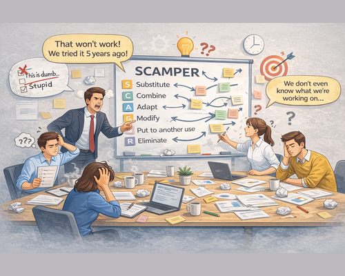 Mechanické projití všech písmen SCAMPER – tým jede otázky „od S po R“ bez ohledu na smysl a kontext.