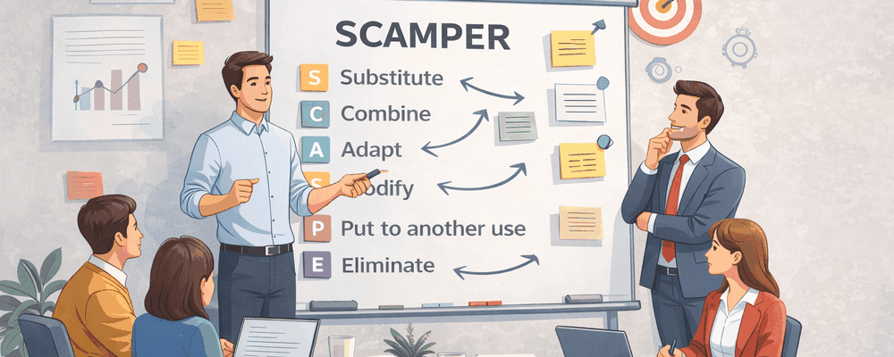Metoda SCAMPER stojí na sadě cílených otázek, které systematicky nutí měnit existující řešení po částech, nikoli ho hodnotit jako celek. Každá otázka představuje jiný typ zásahu do reality a vede k jinému druhu nápadů.
