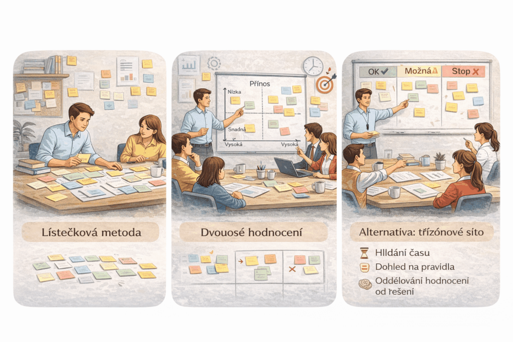Pokud není prostor na matici, lze použít rozdělení na tři zóny: „OK – jdeme dál“, „Možná později“ a „Stop“. Každý nápad musí skončit v jedné z nich.