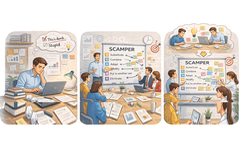 Týmové použití SCAMPERu je vhodné v situacích, kdy problém zasahuje více rolí, oddělení nebo pohledů. Typicky jde o změny procesů, služeb nebo produktů, kde je důležitá nejen kvalita řešení, ale také jeho pochopení a přijetí ostatními.