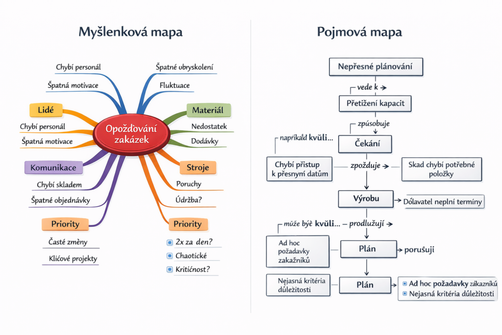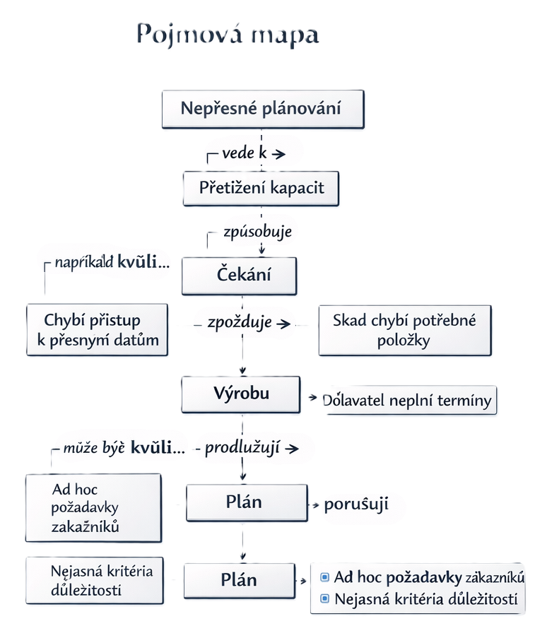 Pojmová mapa pracuje se stejným tématem jinak. Tady už nejde hlavně o to, co všechno s problémem souvisí, ale jaké vztahy mezi jednotlivými prvky skutečně platí a co z čeho vyplývá. Proto jsou mezi pojmy uvedeny konkrétní vazby, například že nepřesné plánování vede k přetížení kapacit nebo že čekání zpomaluje výrobu. Právě tím se pojmová mapa liší: místo volnějšího rozvíjení tématu skládá přesnější logiku problému a nutí pojmenovat vztahy jasněji a konkrétněji.