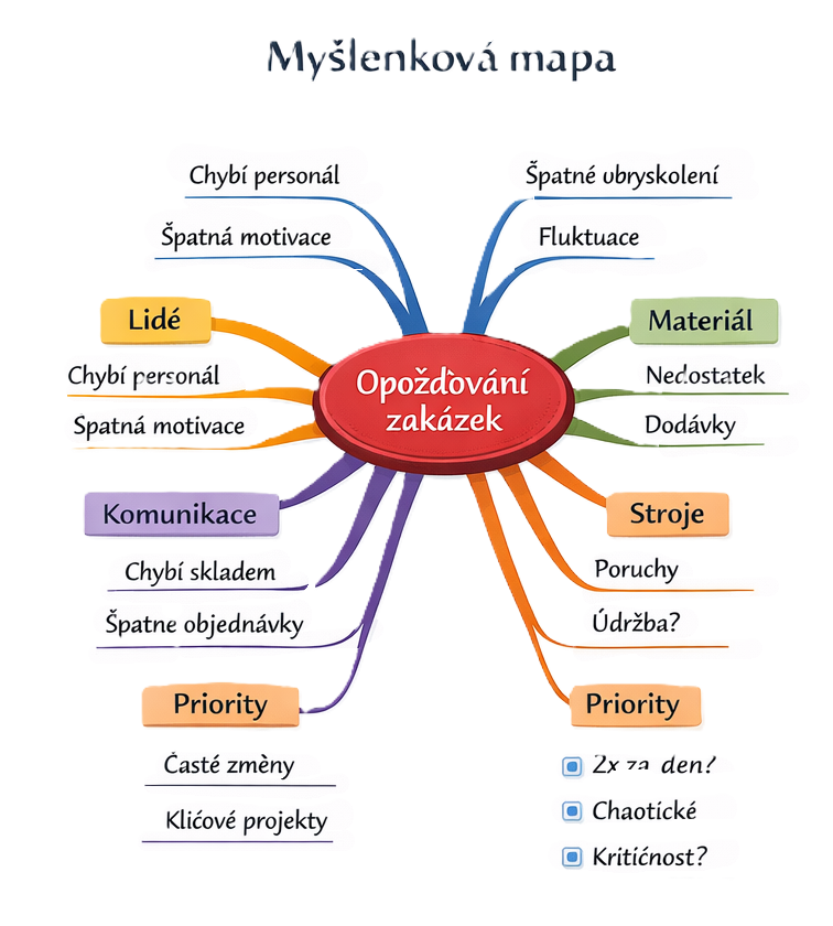 Na tomto příkladu je dobře vidět, k čemu myšlenkovou mapu používám nejčastěji. Když potřebuji rychle otevřít téma a dostat z hlavy ven všechno, co s ním může souviset, nezačínám hledáním přesných vazeb, ale spíš rozvětvováním hlavních oblastí. U problému opožďování zakázek se tak od středu postupně rozbíhají témata jako lidé, materiál, komunikace, stroje nebo priority a pod nimi se objevují další konkrétní podněty, otázky nebo možné příčiny.