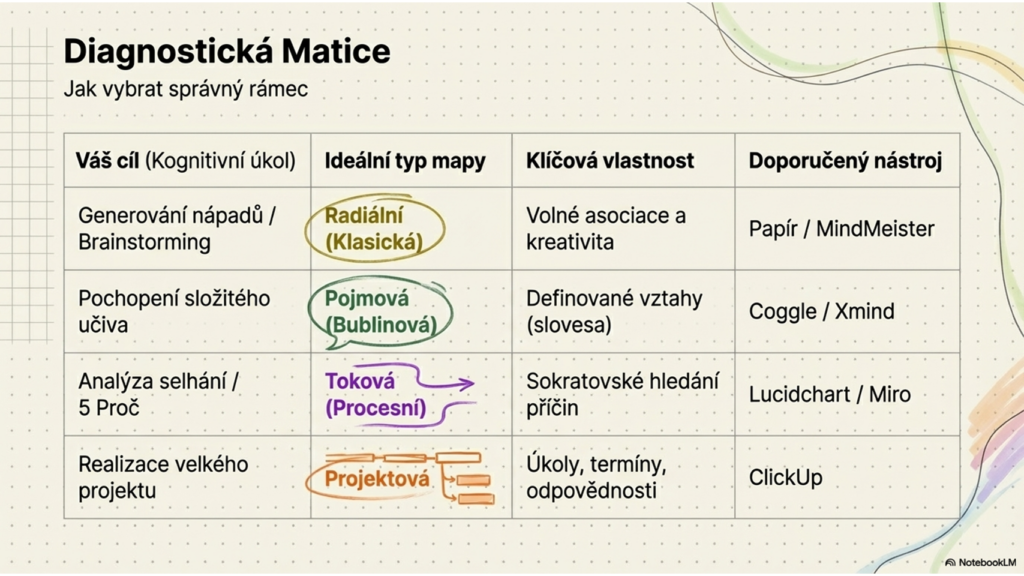 Když si vybírám, jaký typ mapy použít, neřeším to podle zvyku, ale podle několika jednoduchých otázek. Právě ty mi většinou rychle ukážou, jestli potřebuji mapu pro nápady, strukturu, vztahy, proces, nebo už rovnou pro akci.