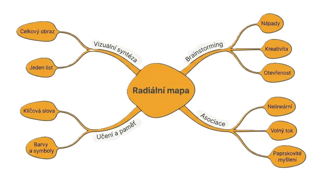 Radiální myšlenková mapa je pro mě základní formát ve chvíli, kdy potřebuji téma rychle otevřít, rozvinout do šířky a zachytit první proud nápadů. Vychází z jednoho ústředního bodu umístěného uprostřed a od něj se paprskovitě rozbíhají hlavní i vedlejší větve. Její síla stojí na asociacích, klíčových slovech, barvách a přirozeném toku myšlení. Právě proto dobře funguje při brainstormingu, hledání tématu, shrnutí přednášky nebo v okamžiku, kdy si člověk potřebuje rychle udělat pořádek v hlavě.