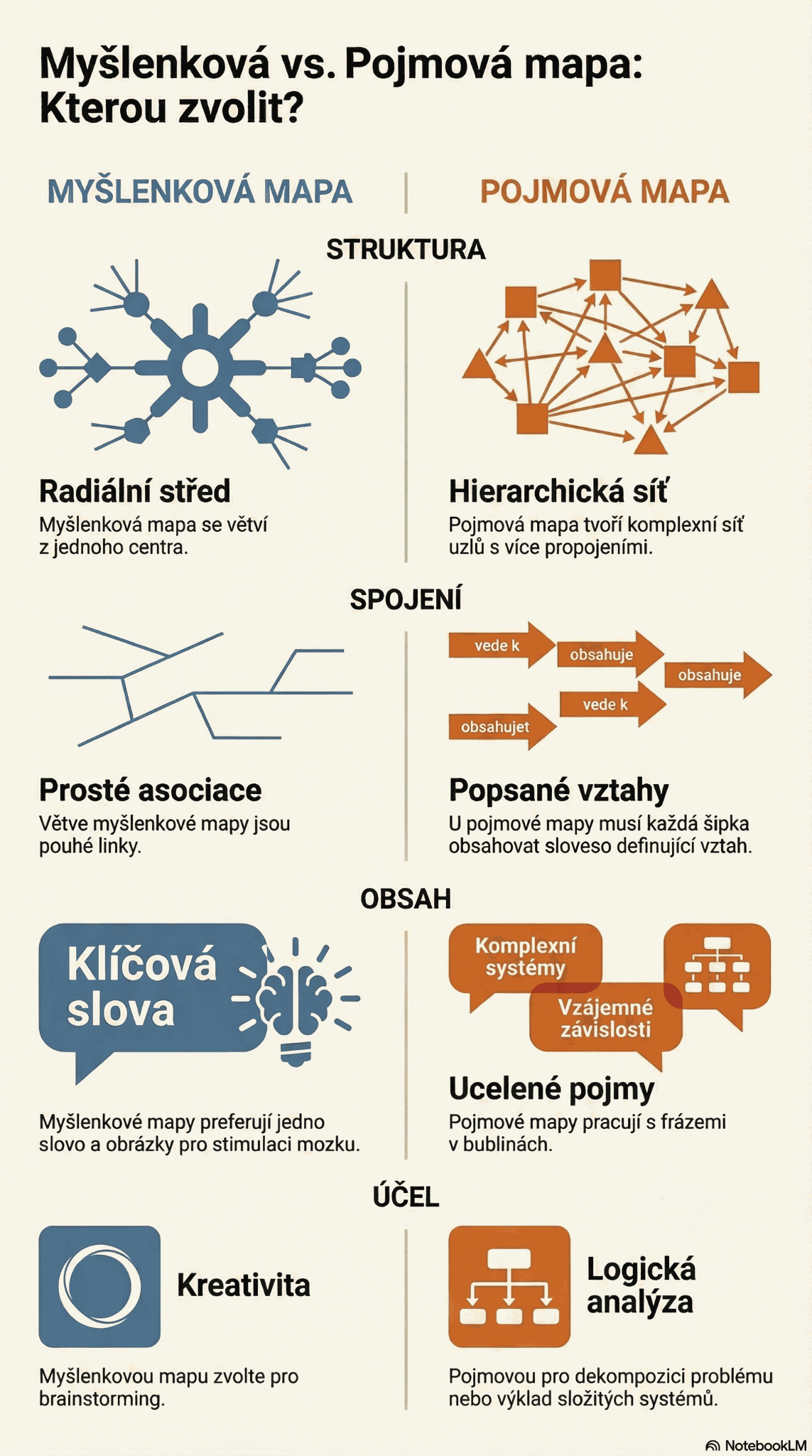 Pojmová mapa mi naopak dává větší smysl ve chvíli, kdy už nepotřebuji tolik generovat nové podněty, ale spíš přesněji pochopit, co s čím souvisí, co z čeho vyplývá a jaké vztahy mezi jednotlivými prvky skutečně jsou. I proto mezi nimi vnímám rozdíl ne ani tak ve vzhledu, ale hlavně v účelu: jedna mi pomáhá téma otevřít, druhá ho lépe vysvětlit.