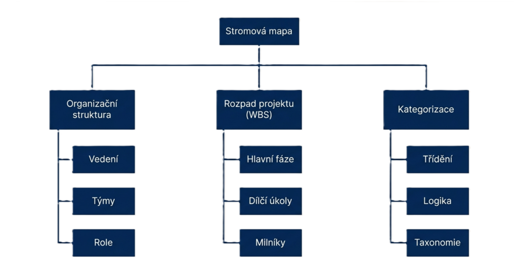 Stromová mapa je vhodná tam, kde potřebuji jasně ukázat nadřazenost a podřazenost, tedy vztah celku a jeho částí. Na rozdíl od radiální mapy nemá tolik volný charakter, ale staví na přehledné hierarchii. Informace v ní obvykle proudí shora dolů nebo od hlavní kategorie k podkategoriím. V praxi ji považuji za velmi užitečnou při tvorbě organizačních struktur, rozpadů projektů na části, kategorizaci většího množství informací nebo při práci s metodou WBS.