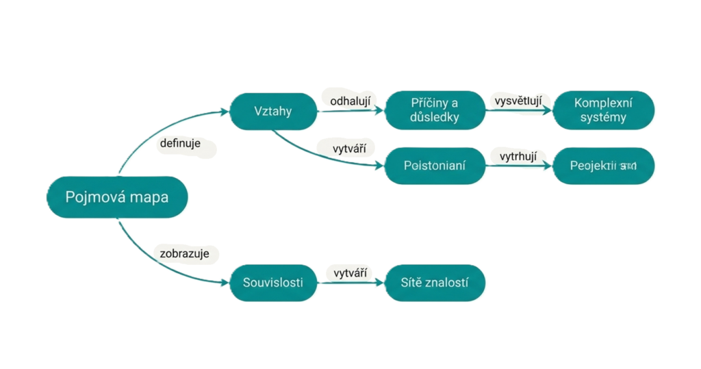 Na rozdíl od radiální mapy je zde menší důraz na volnost a větší na přesnost. Pojmová mapa mě nutí pojmenovat, co z čeho vyplývá, co co ovlivňuje, co je součástí čeho a jaké vazby mezi prvky skutečně platí. Právě proto se dobře hodí pro analýzu složitých systémů, výklad příčinných souvislostí nebo práci s tématy, kde nestačí jen sbírat nápady.