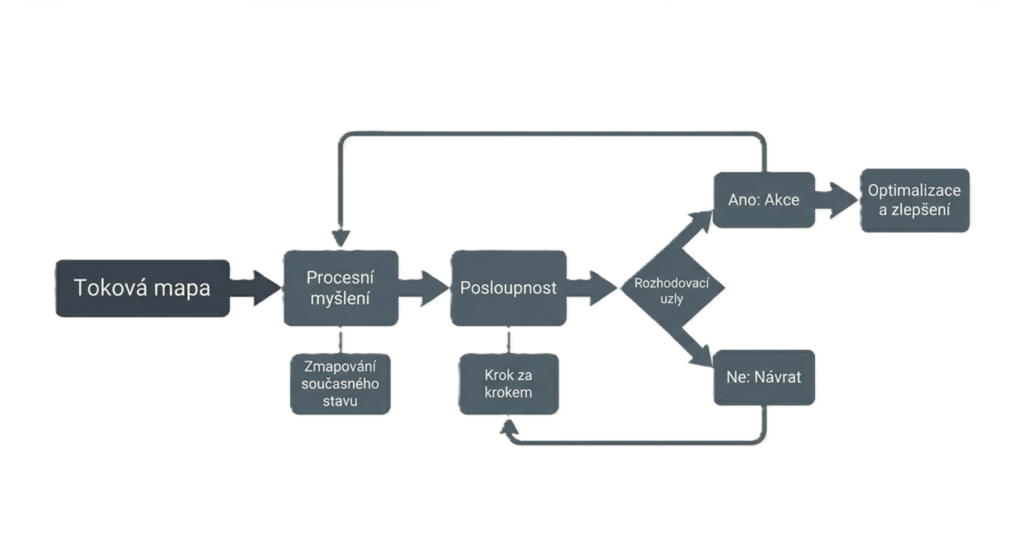 Toková mapa převádí statické téma do procesu v čase. Na rozdíl od předchozích typů neukazuje jen oblasti nebo vztahy, ale hlavně sled kroků, směr toku a často i vazbu mezi příčinou a důsledkem. V praxi ji vnímám jako vhodný nástroj ve chvíli, kdy potřebuji pochopit, jak něco probíhá, kde vzniká problém, kde se proces zadrhává nebo jak na sebe jednotlivé kroky navazují. Dobře funguje pro workflow, zákaznickou cestu, logistiku, ale i pro Root Cause Analysis, například při použití metod jako 5 Proč nebo Ishikawa.