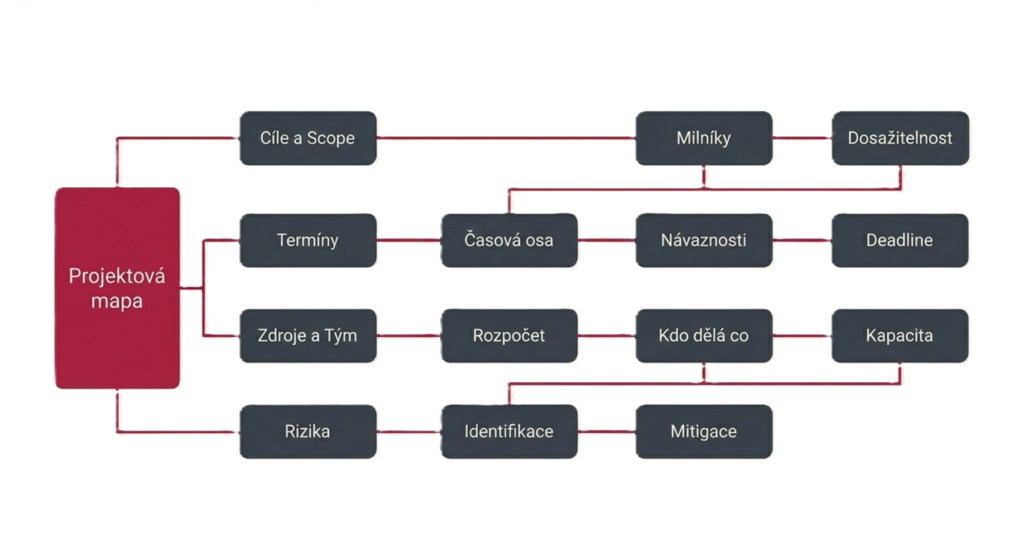 Projektová mapa je podle mě nejpraktičtější ve chvíli, kdy už nechci zůstat jen u myšlenek, ale potřebuji je převést do akce. Spojuje výhody mapování s disciplínou projektového řízení. V jejím středu bývá hlavní cíl nebo projekt a jednotlivé větve se dál rozpadají do oblastí jako úkoly, odpovědnosti, termíny, milníky, případně rizika nebo zdroje. Na rozdíl od klasické myšlenkové mapy už zde nejde jen o objevování tématu, ale o jeho přetavení do realizovatelné struktury.